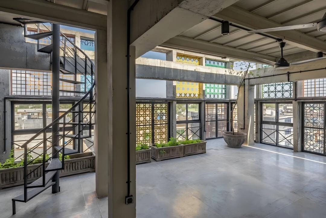 间的视觉连通性。裸露的设备管线便于维护。部分窗户采用色彩鲜艳的金属镂空屏(jaali),既能遮阳